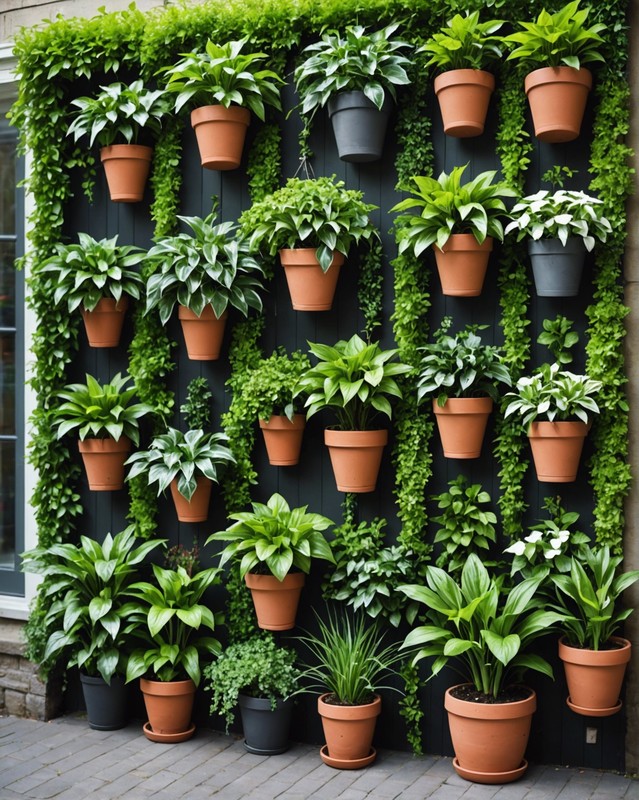 Transform your patio into an oasis with a captivating vertical lush garden adorned with hanging pots.