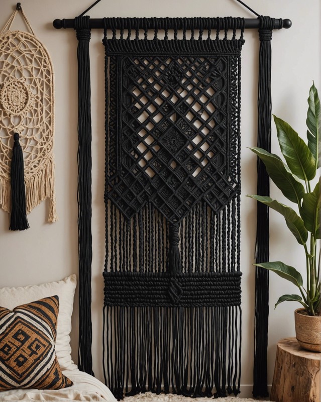 The intricate black macrame wall decor in this bohemian bedroom is a stunning focal point. The intricate knots and geometric patterns create a dramatic and sophisticated look that adds depth and character to the space.