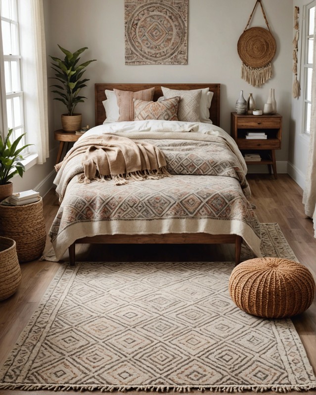 Geometric rugs, with their clean lines and bold patterns, are a popular choice for boho-style bedrooms.