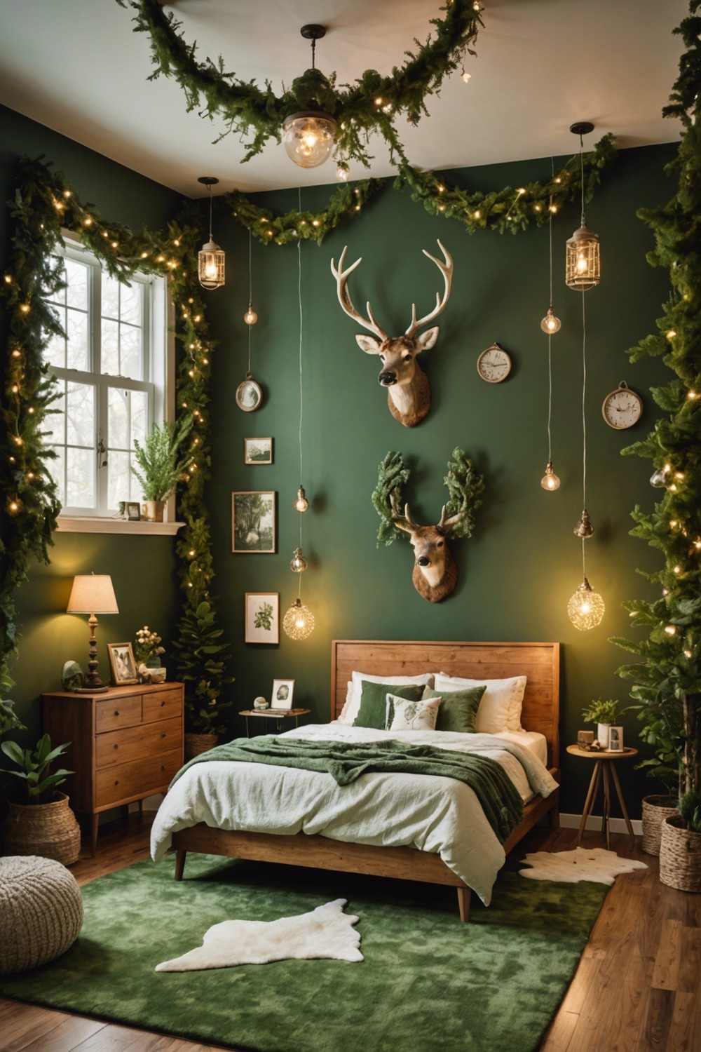Think twinkling string lights, moss-green walls, and a plush area rug that resembles a forest floor.