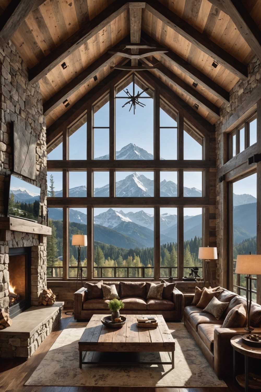 Vaulted ceilings, often featuring exposed beams or wooden accents, add a touch of rustic charm, while large windows and sliding glass doors bring in natural light and breathtaking views of the surrounding mountains.
