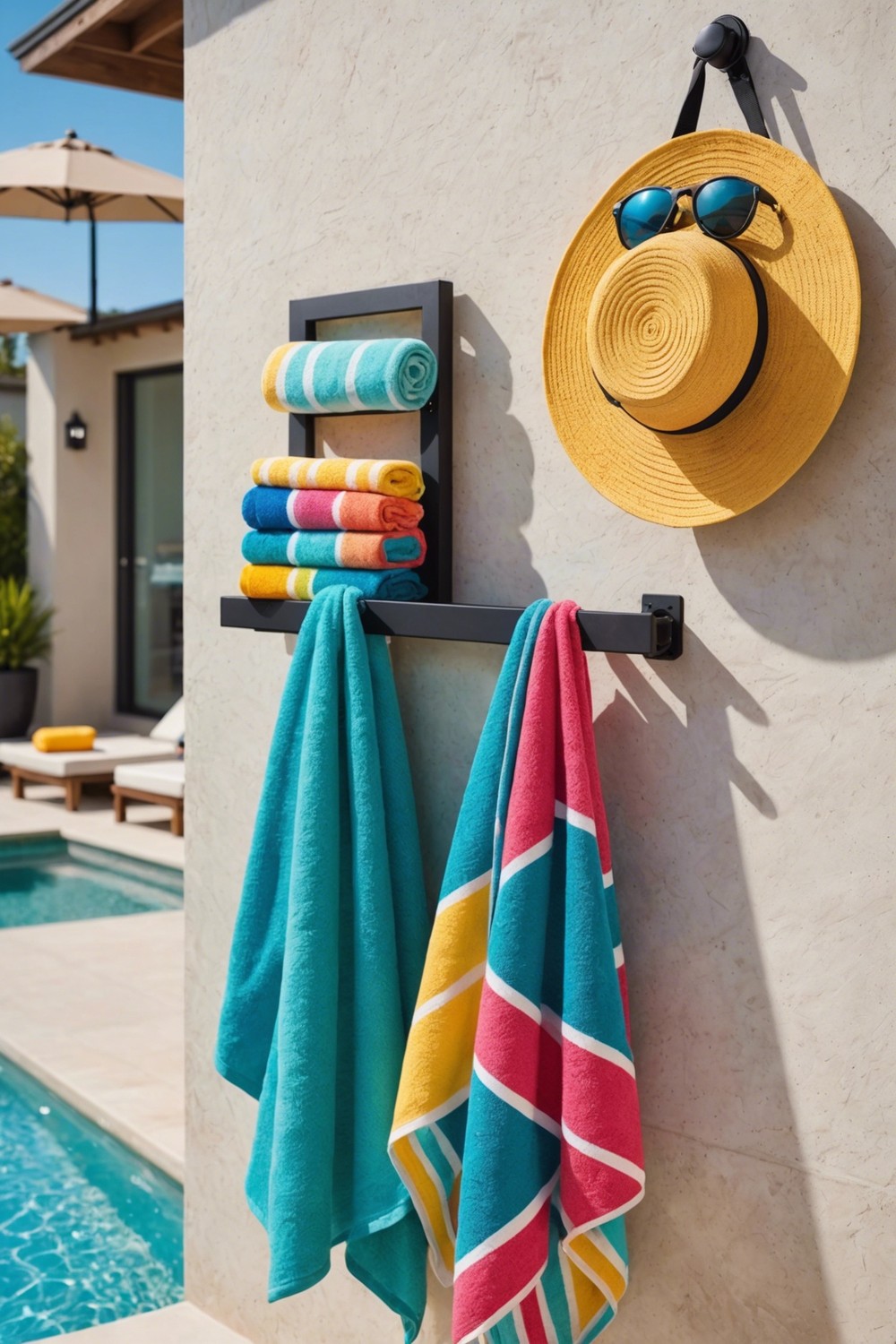 These racks not only keep your towels organized but also offer additional storage for other accessories like pool bags, goggles, or flip-flops.