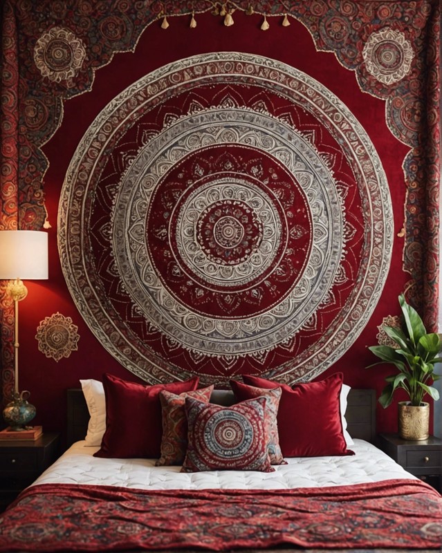 The tufted red velvet upholstery adds a touch of luxury, while the mandala tapestry brings in a bohemian vibe.
