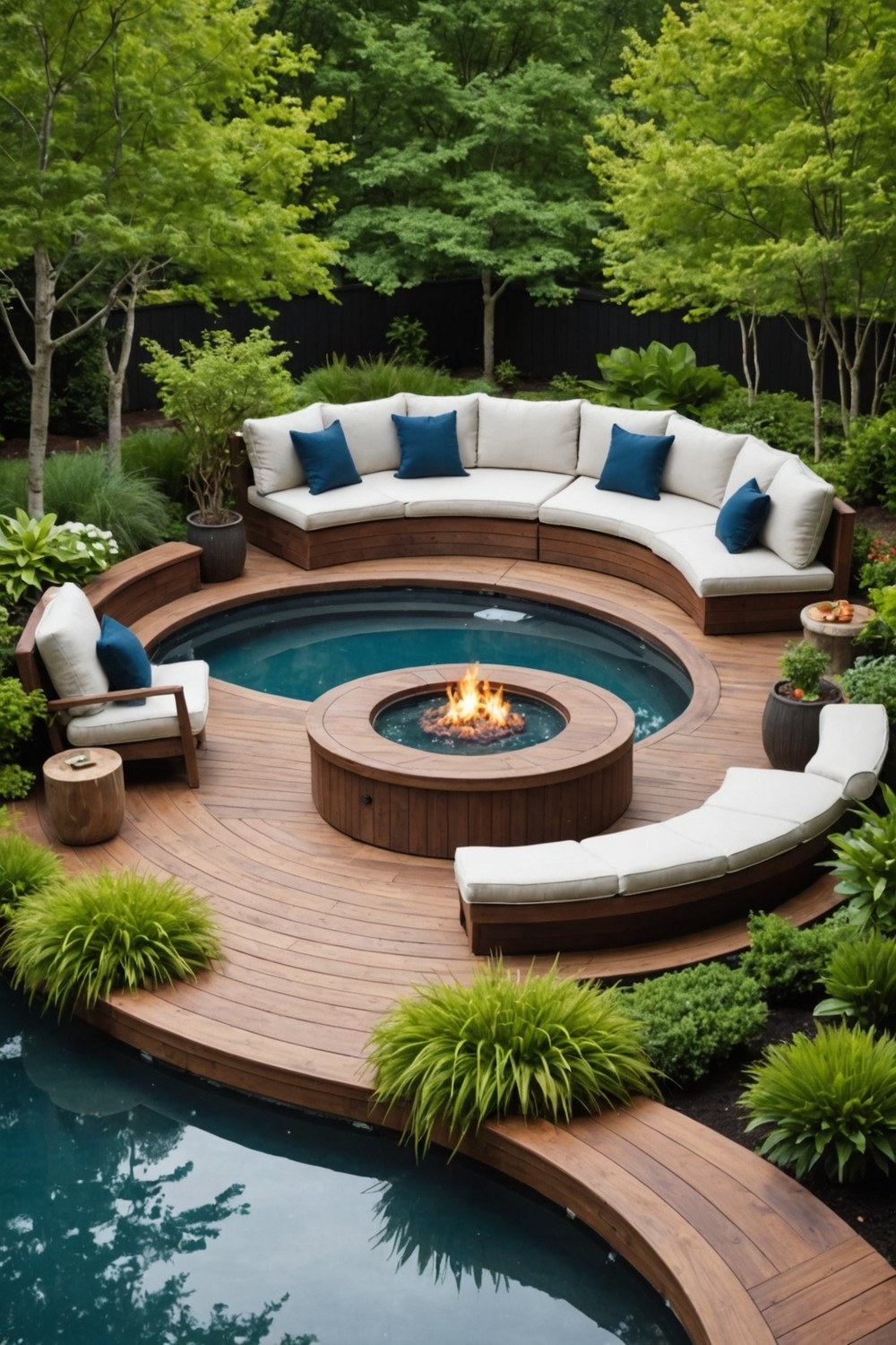 With a round pool deck as the focal point, this setup creates a cohesive and inviting outdoor space that’s perfect for family gatherings, dinner parties, or simply lounging around on a sunny day.