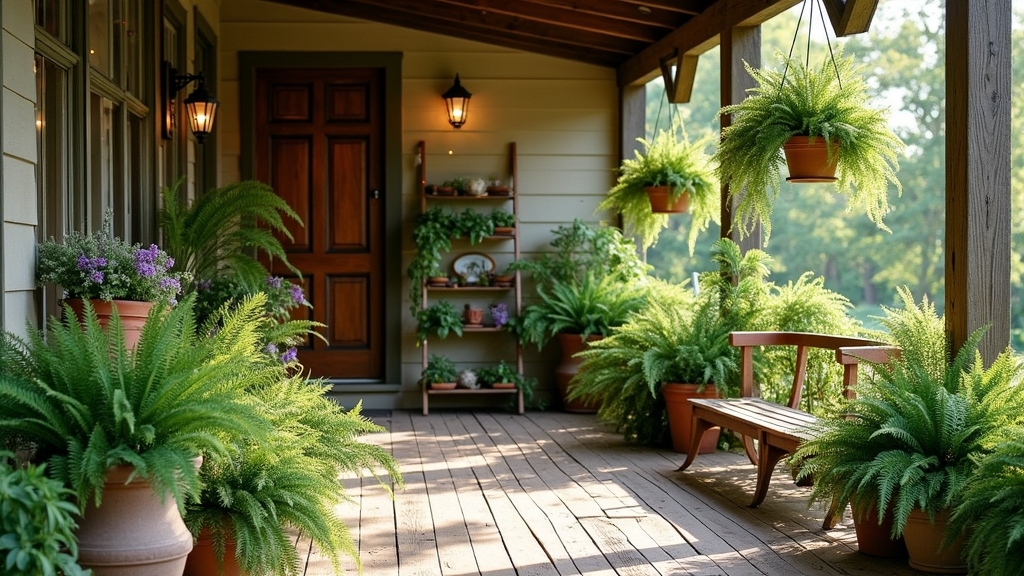 Embracing a rustic theme on your front porch can create a warm and inviting atmosphere, and ferns are perfect for this style. To enhance your space, use rustic accents like wooden planters or metal pots. Combine these with the ferns’ natural textures for a cohesive look. Arrange them alongside other natural elements, like stones or twine, to achieve a balanced, rustic charm.